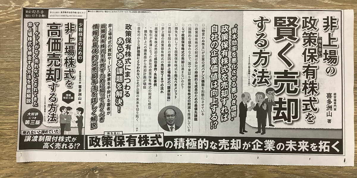 メディア掲載履歴 4月1日、洲山著の書籍二冊が日経新聞に掲載されました Amazonでの購入はこちらから 本書の内容 第一章…問題視される政策保有株式 第二章…なぜ政策保有株式の売却は進まないのか 第三章…非上場の政策保有株式の売却方法 第四章…政策保有株式売却の成功事例・失敗事例 第五章…政策保有株式の積極的な売却は自社の企業価値を向上させる Amazonでの購入はこちらから 本書の内容 第一章…非上場株式が宝の持ち腐れになっている!? 第二章…その非上場株式、放置すると納税額が跳ね上がる可能性も 第三章…非上場株式を換金する方法とその仕組み 第四章…非上場会社の株式換金におけるメリットと注意点 第五章…非上場会社の株式換金~事例集~